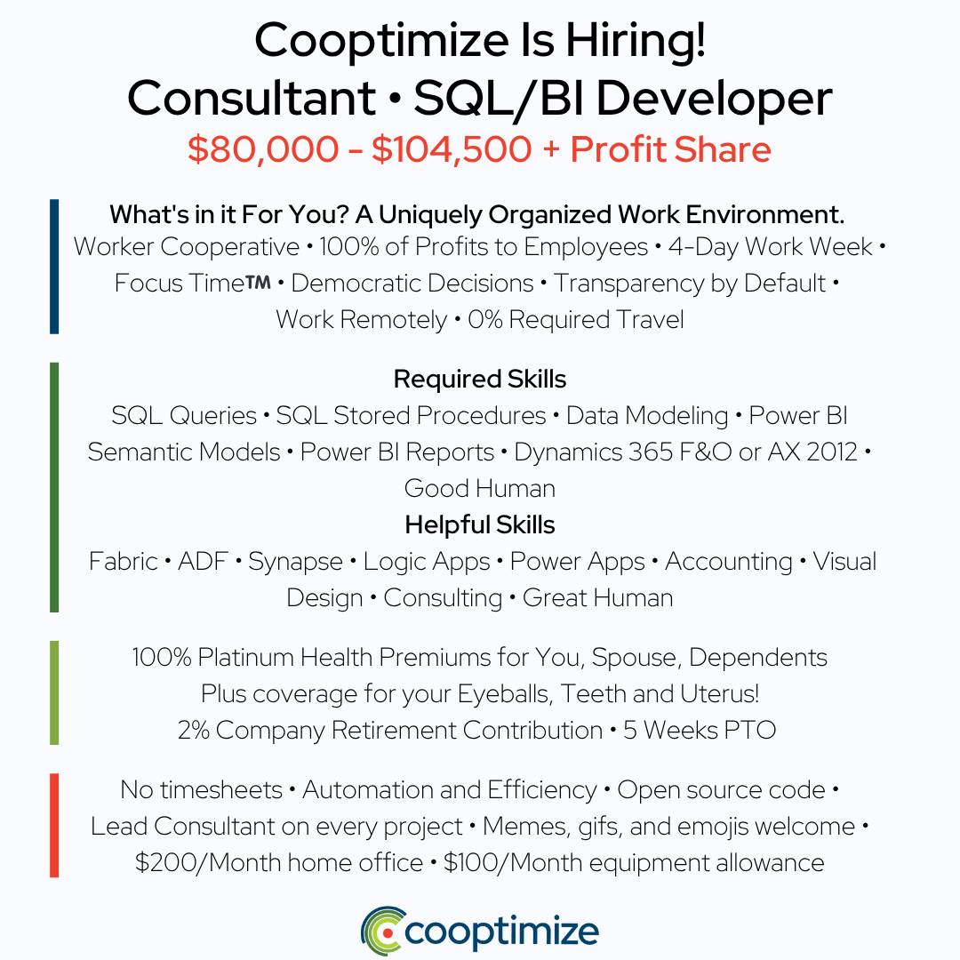 My data consulting cooperative, Cooptimize, is searching for a SQL/BI Developer.