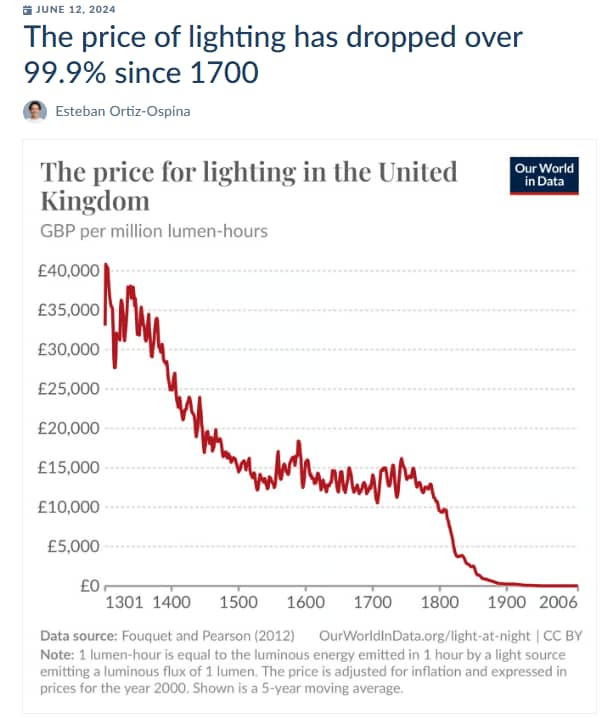 A cost chart illustrates how artificial light has gone from luxury to ubiquitous triviality. It's a tribute to technology progressively removing frictions from daily life over centuries.
