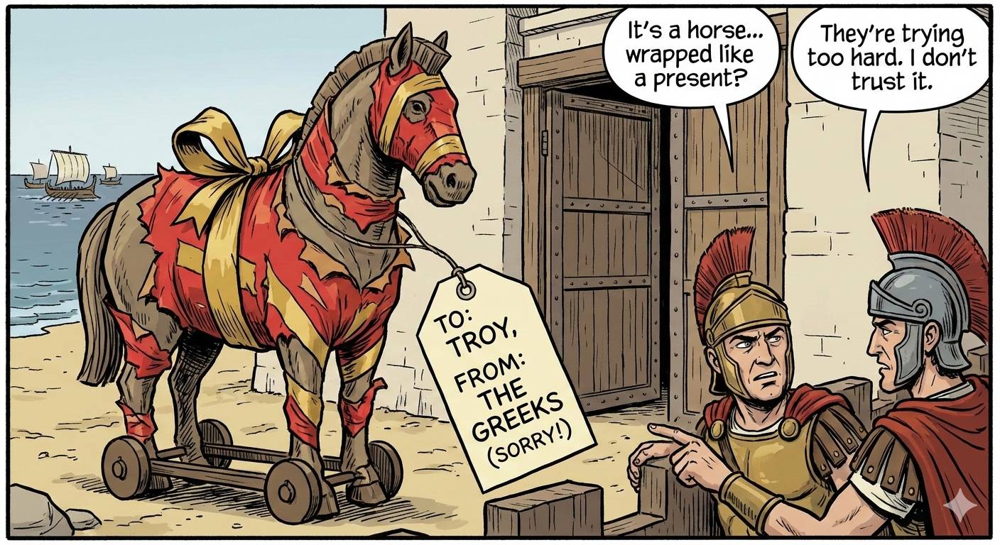 One night last year, when Lawrence had trouble sleeping, I read him the Trojan horse story from a kid's version of the Odyssey. In the morning I asked him about it to see how much he'd remembered.